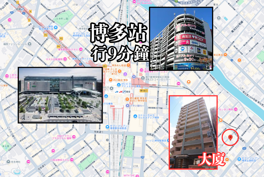 - 由「博多」站行去大廈只需9分鐘,必升物件