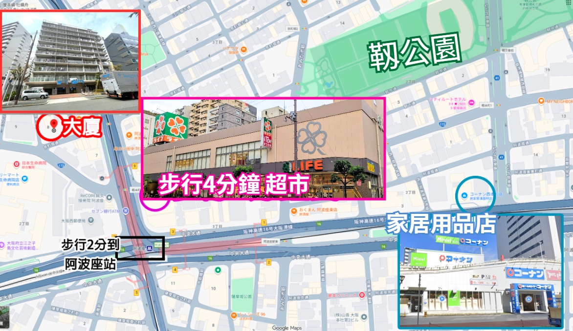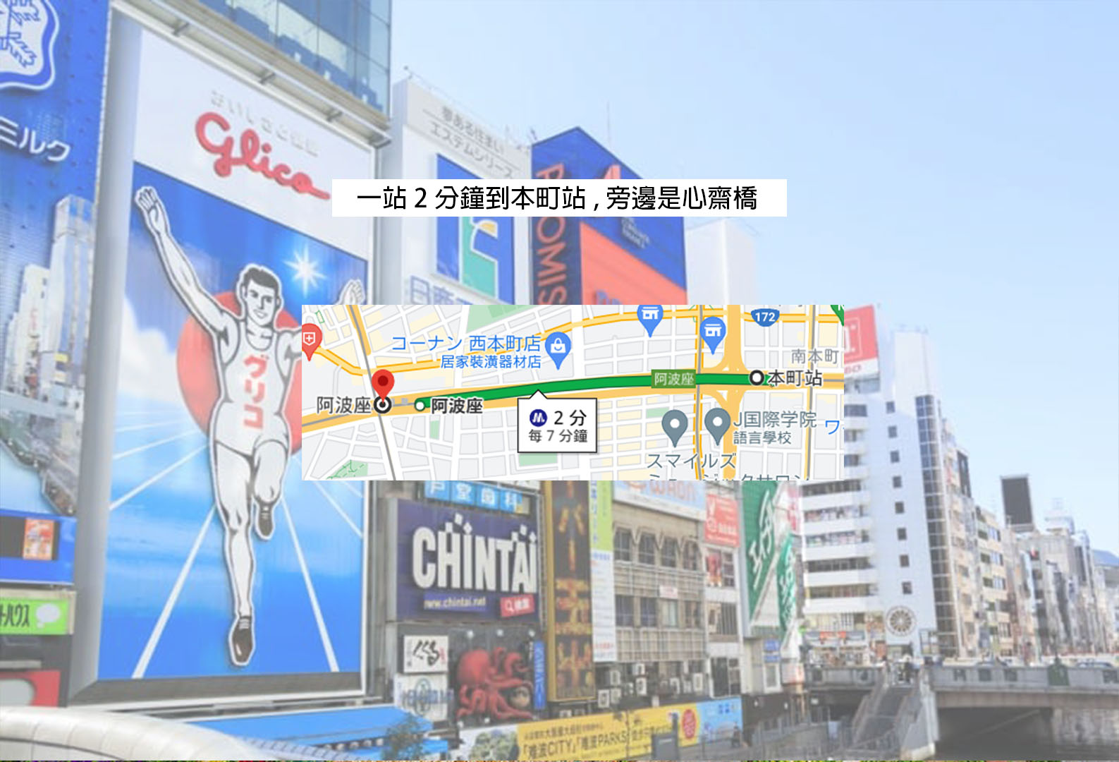 -徒步4分鐘到「阿波座」站,一站2分鐘到「本町」站,旁邊是心齋橋;