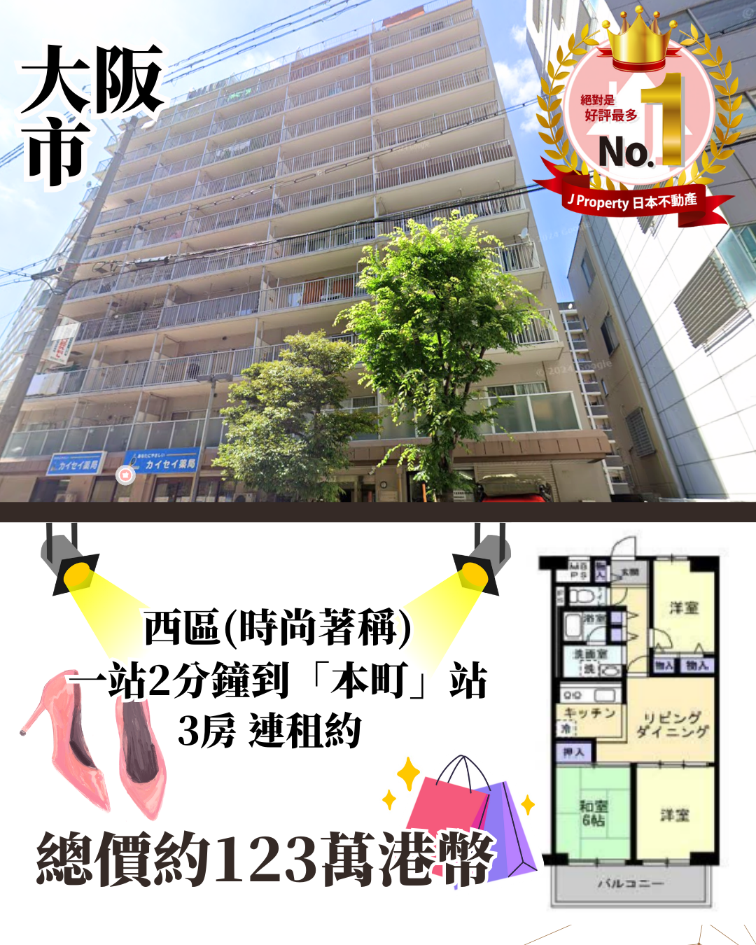 J Property總部在大阪難波,是日本當地地產, 大阪西區3房單位,一站2分鐘到「本町」站,旁邊是心齋橋, 連租約,連開支只需HKD123萬