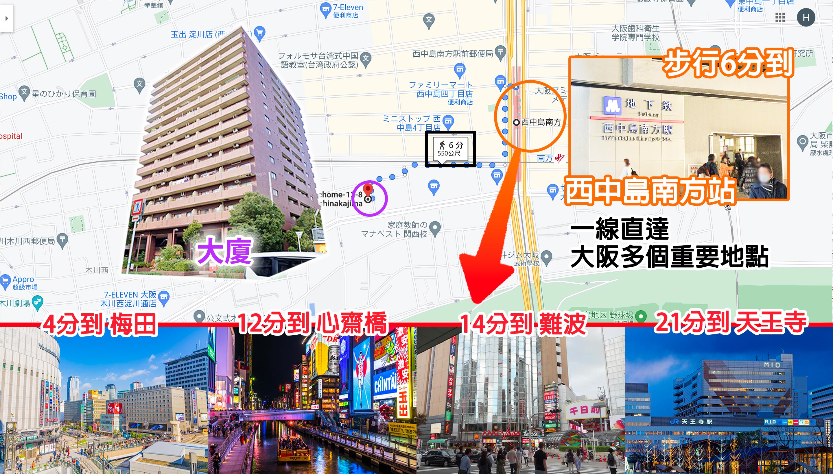 -禦堂筋線1分到新大阪,4分到梅田,12分到心齋橋、14分到難波,21分到天王寺,交通非常方便