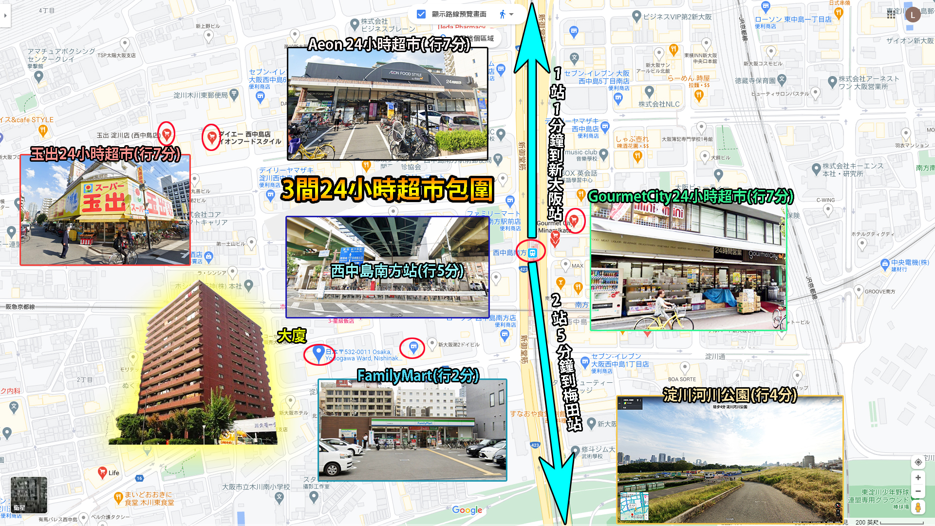 | 交通 | 6分鐘到 到 西中島南方站 |