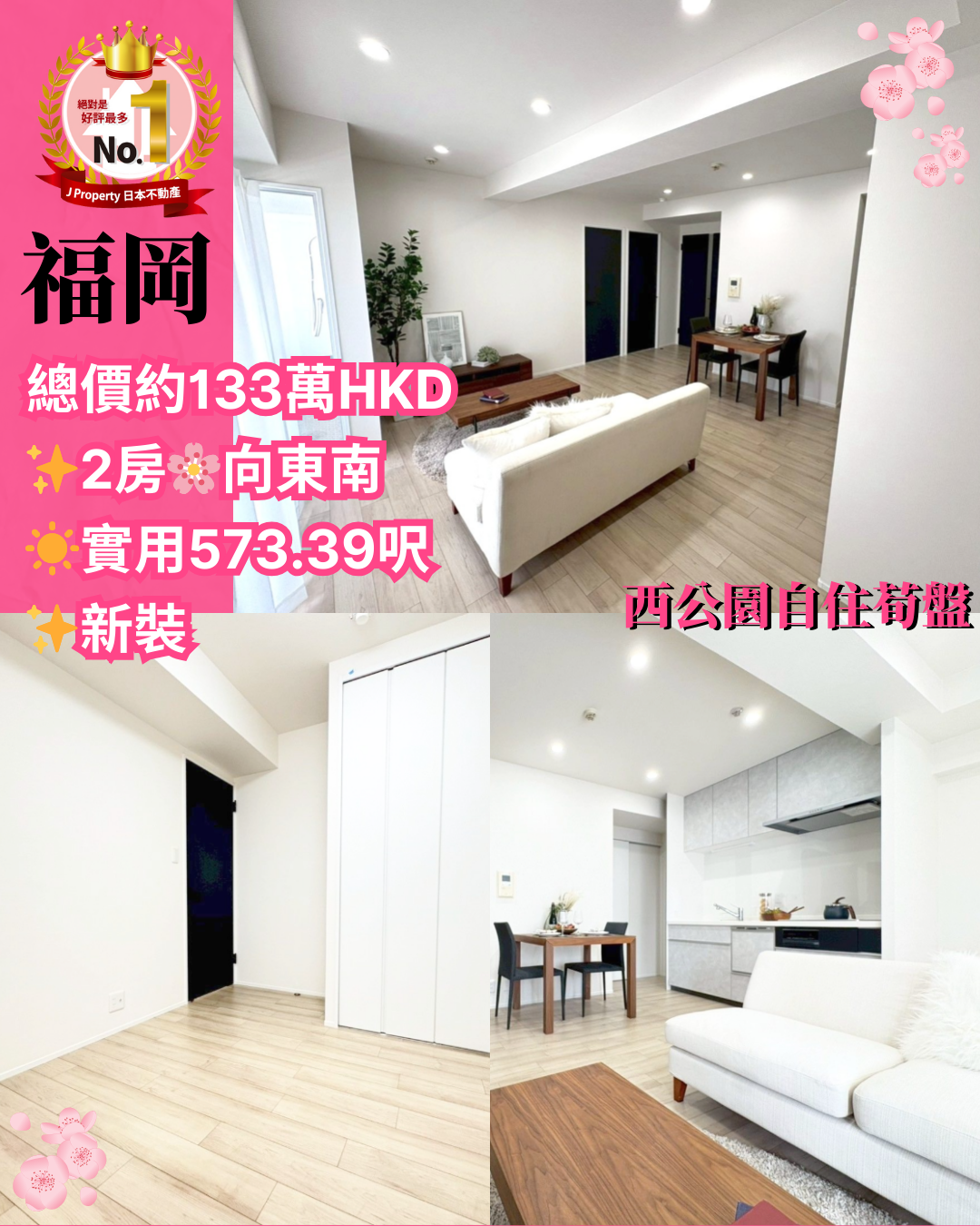 【福岡西公園自住荀盤】 ,2房,向東南,實用573.39呎,新裝 ,總價$133萬港幣即入住