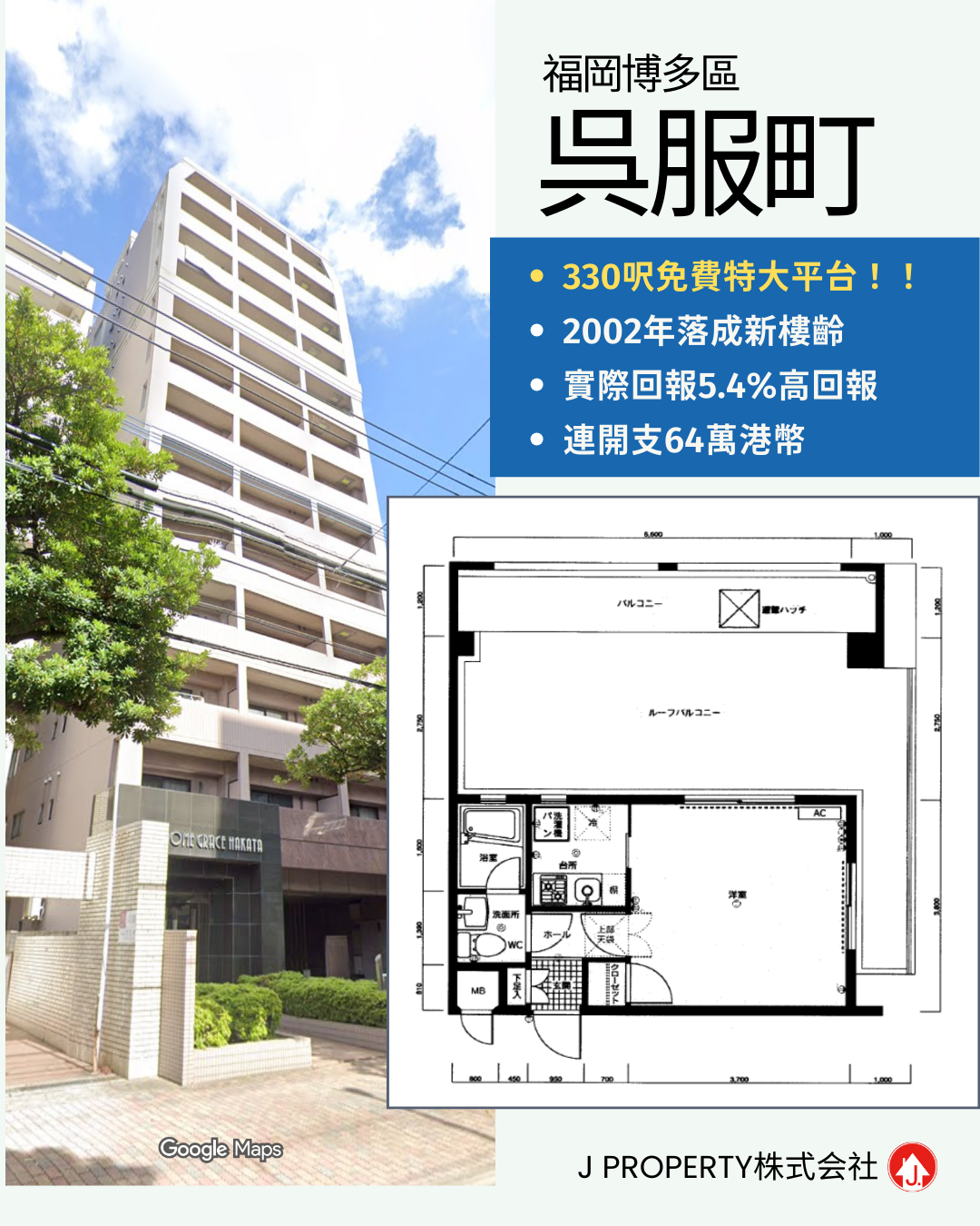 【好評最多的日本物業公司】 福岡博多區收租盤,高層、附贈330呎特大平台,2002年落成,高實際回報5.4% 總價$64萬港幣即收租