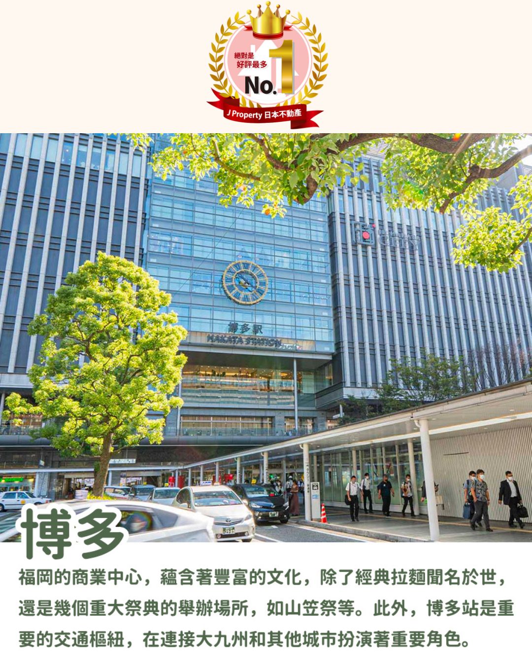 - 大廈行6分鐘到「東比惠」站,空港線1站3分鐘直達「福岡機場」,1站3分鐘直達博多站(或從大廈出發步行12分鐘均可到博多站) ;