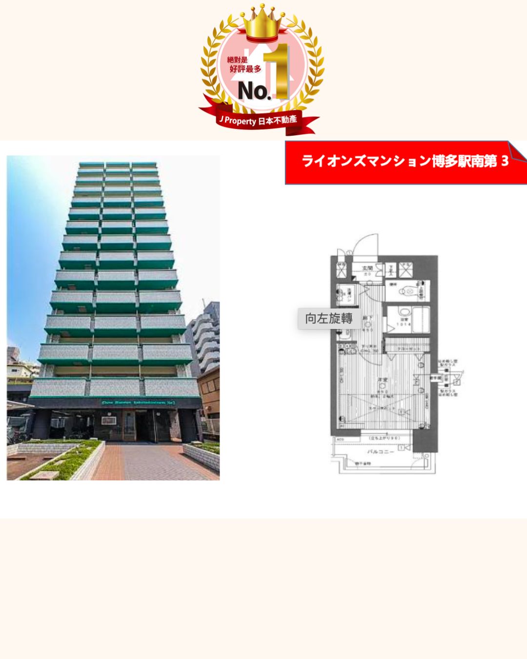 【J Property獲最多人稱老實的日本房產】 福岡博多兩面採光,中層5樓收租單位 ,總價$38.8萬港幣即收租