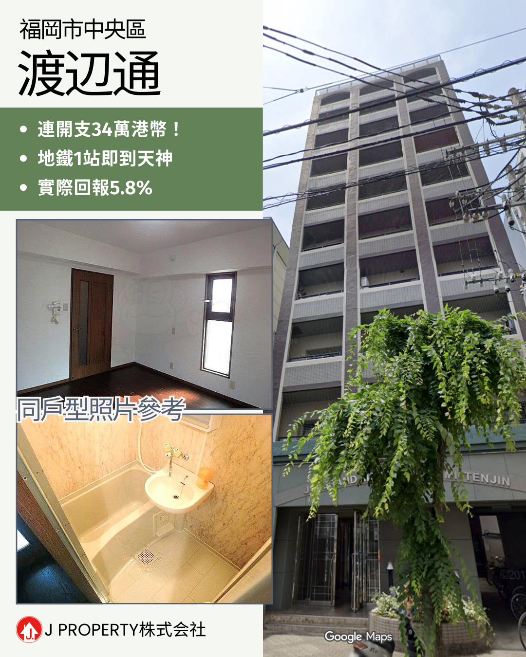福岡中央區,連開支34萬港幣,中高層7樓單邊,一站到「天神」 實際回報5.8%