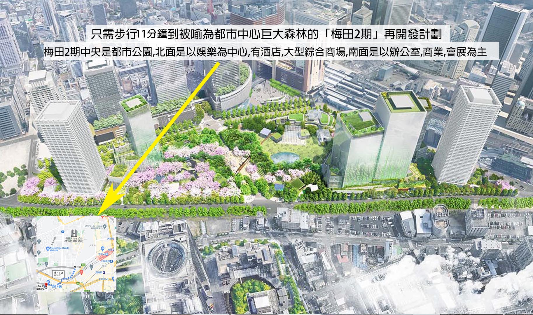 緊貼「梅田二期」Grand Green Osaka 再開發區,集都心公園、辦公、酒店、商業與創新設施於一體,帶動租務與資本增值。