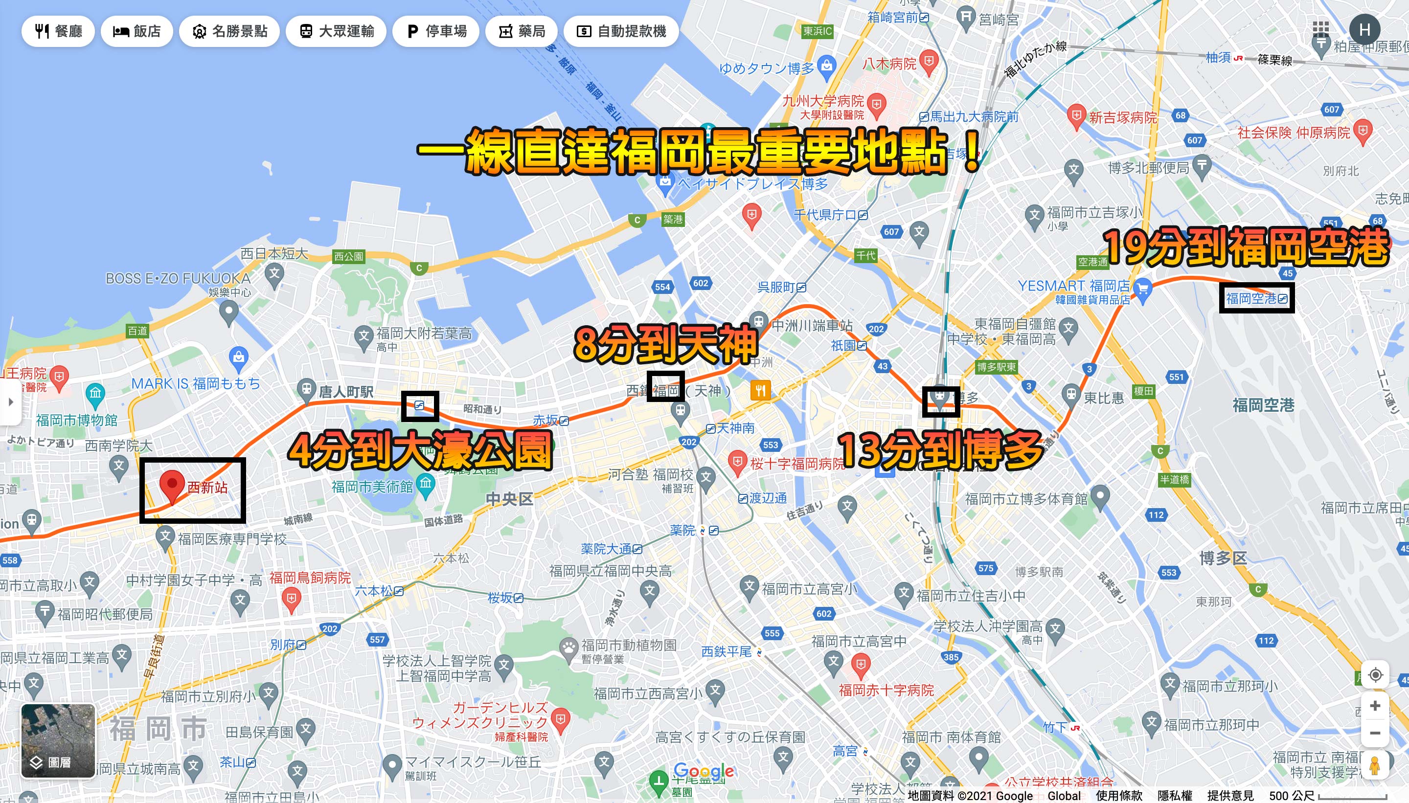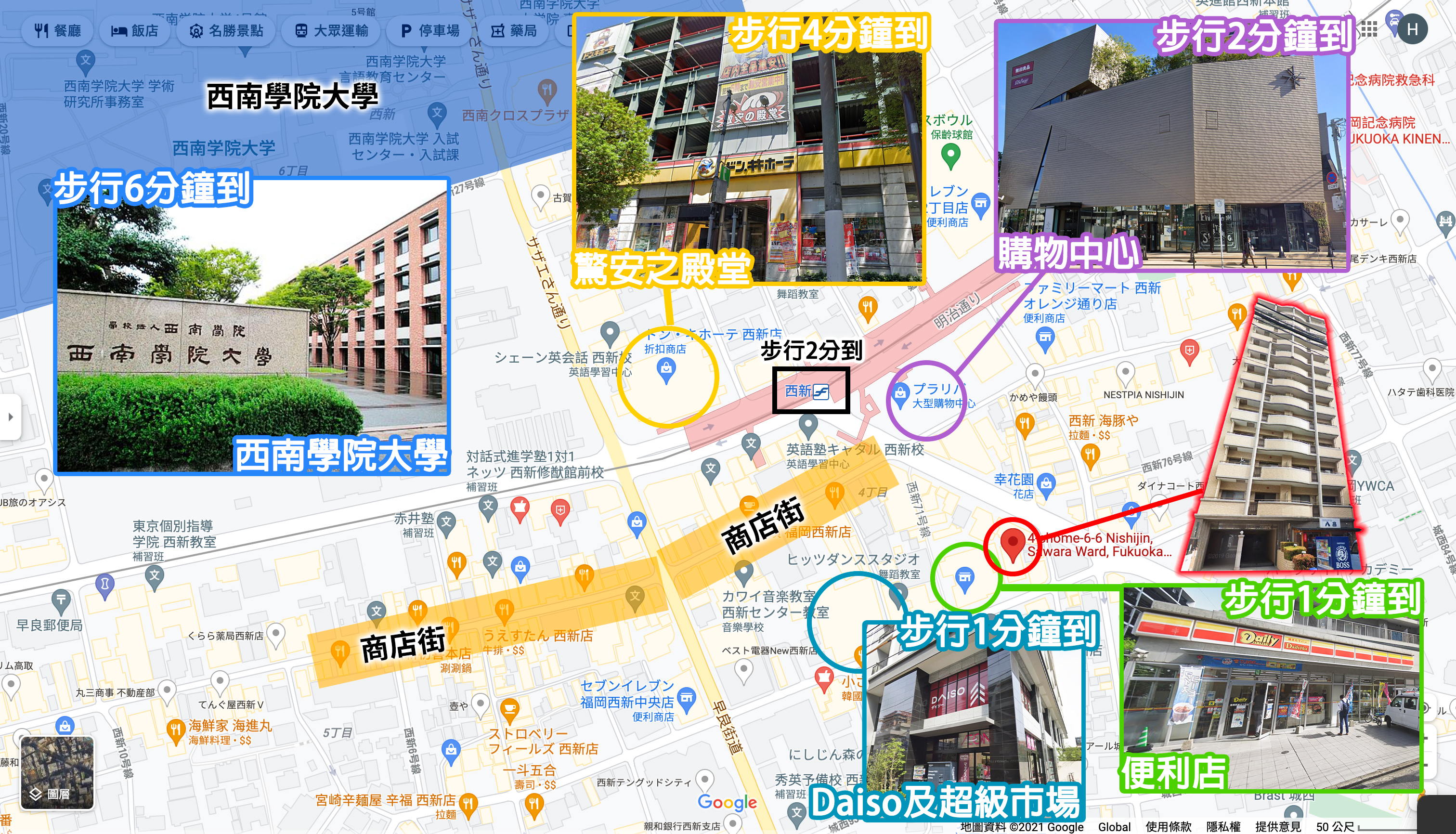 -為福岡副市中心,有極旺的「西新中央商店街」及激安殿堂,更有不少大學及高中,是眾多年輕人聚集之地,出租率極好的一個地方,絕對有潛力投資價值;