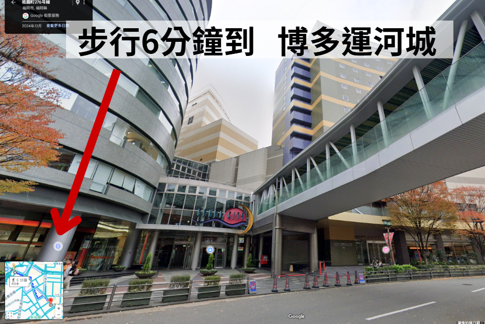 行6分鐘就「博多運河城」,步行8分鐘到「博多」站,九州地區最大站,各式百貨公司、商場、品牌直營店就在博多商圈;
