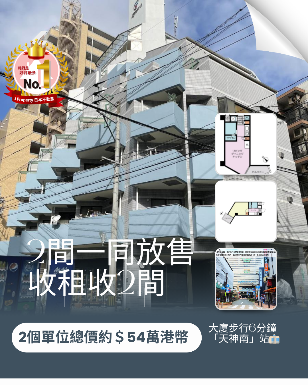 【福岡「天神」猶如香港「尖沙咀」地段】 一次過買兩個單位,收租收2間,大廈步行6分鐘「天神南」站,2個單位總價約$54萬港幣即收租