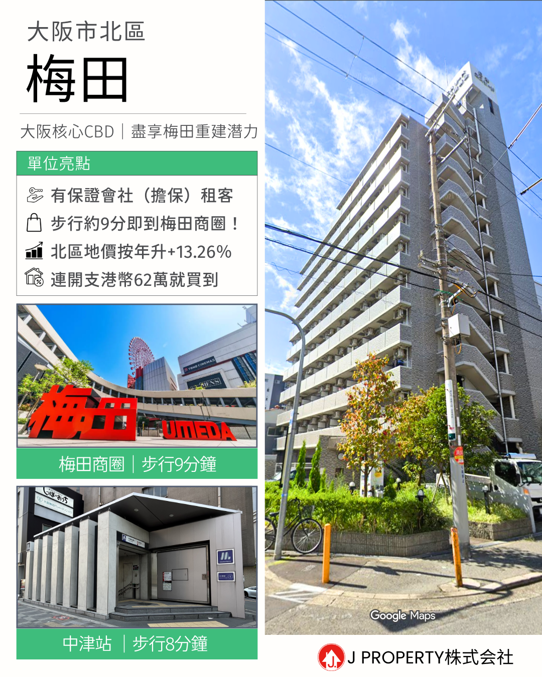 【梅田平價收租盤】【Whatsapp我拎資料啦!】 大阪北區(如中環)可步行直達梅田!! 有保證會社租客 年輕樓齡 全包62萬HKD 【北區地價按年升+13.26%】