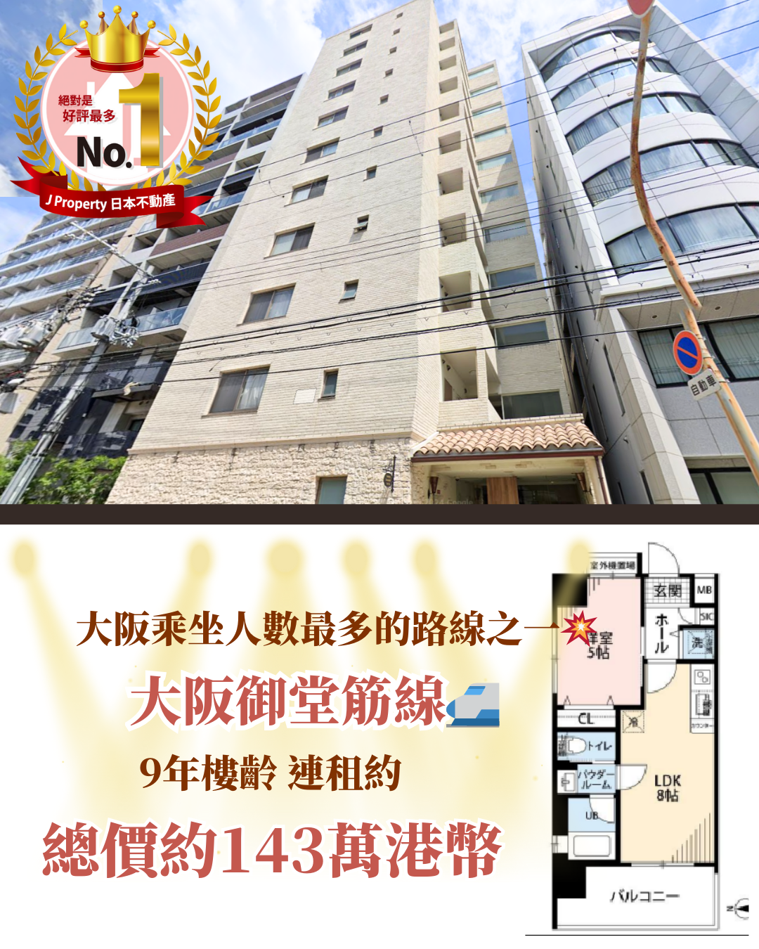 大阪禦堂筋線 大阪乘坐人數最多的路線之一 單邊 1房1廳單位 9年樓齡連租約 連開支只需HKD143萬