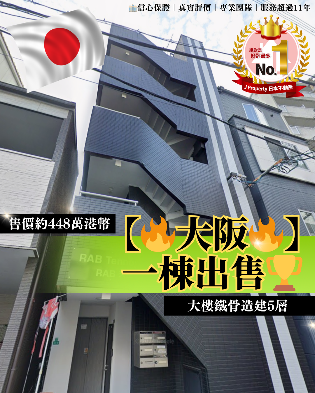 大阪JProperty 株式會社一棟專家,只推實盤源歡迎查詢 【大阪一棟】阿倍野區,行1分鐘到地鐵站 一站到天王寺站 鐵骨造建5層  ,連土地,售價約448萬港幣